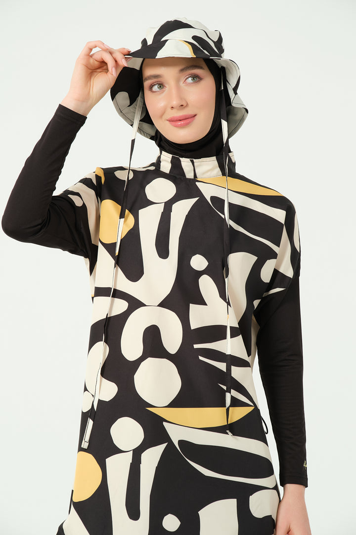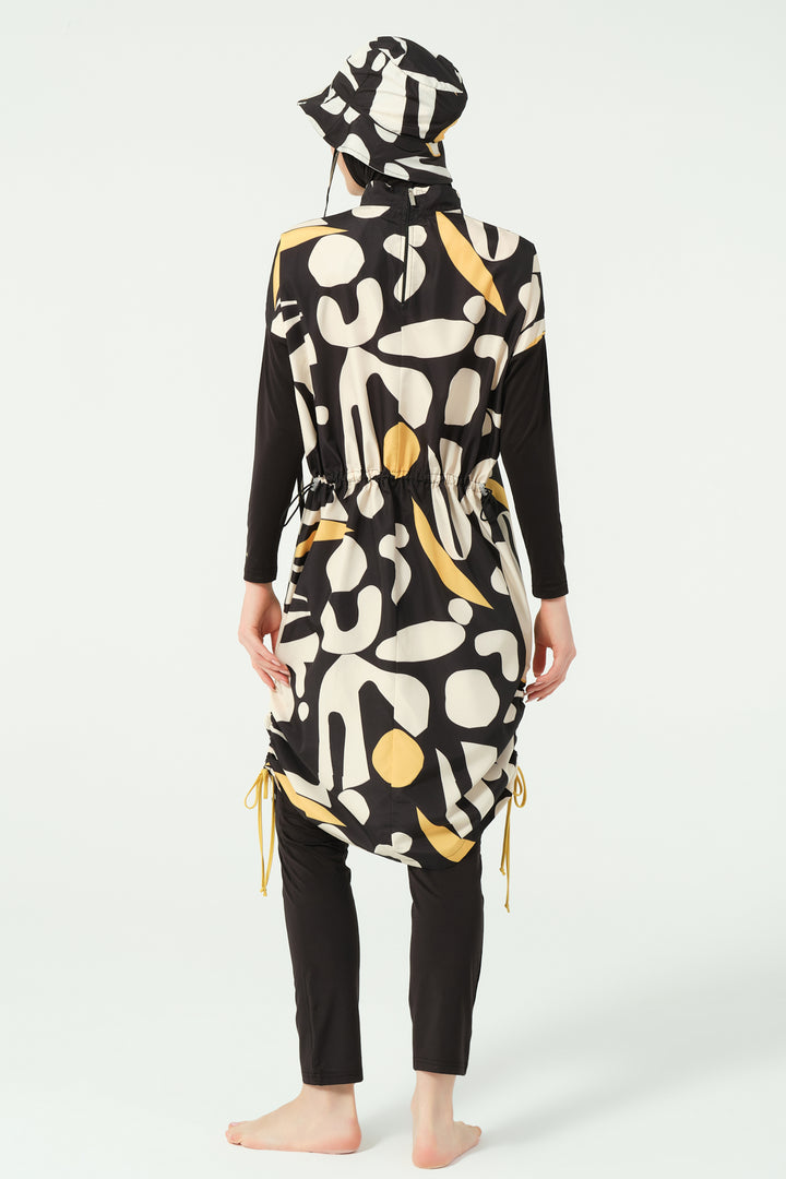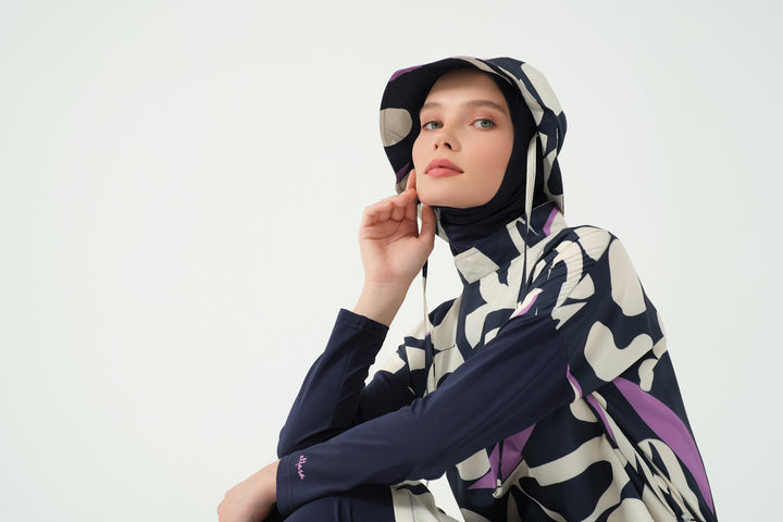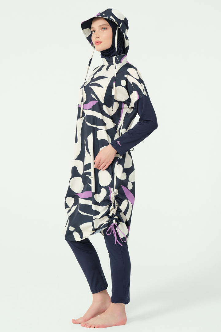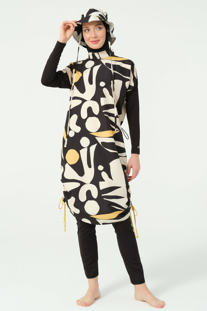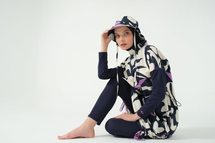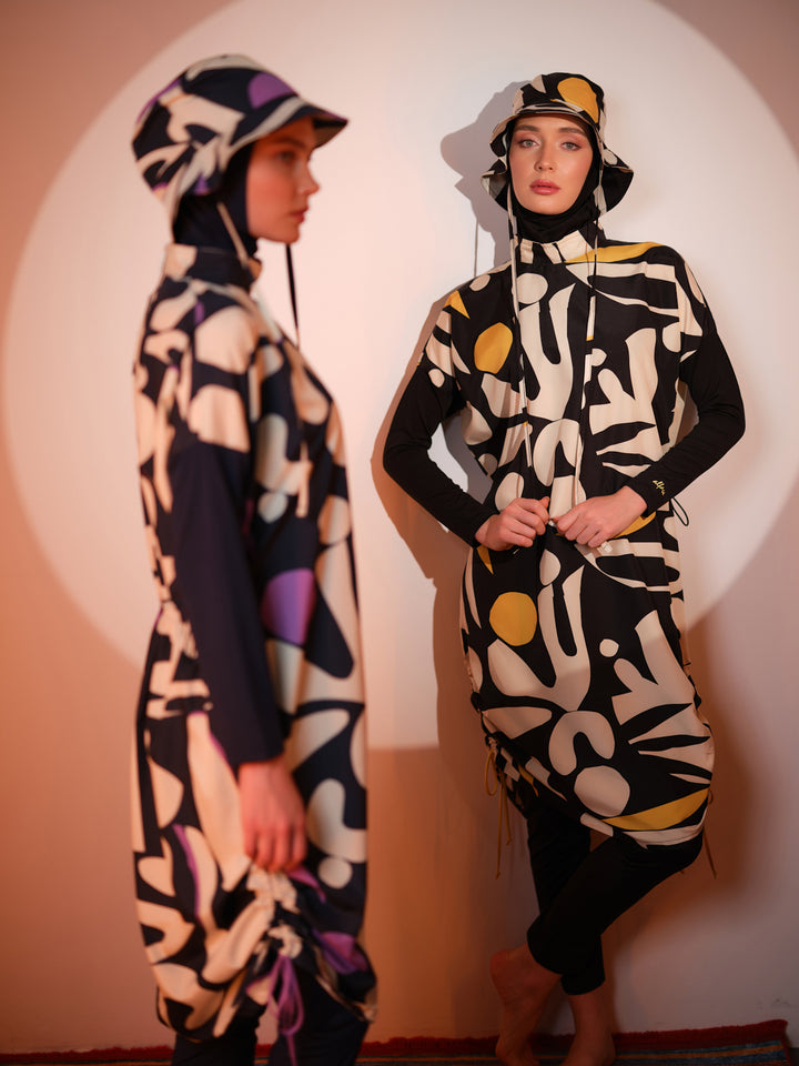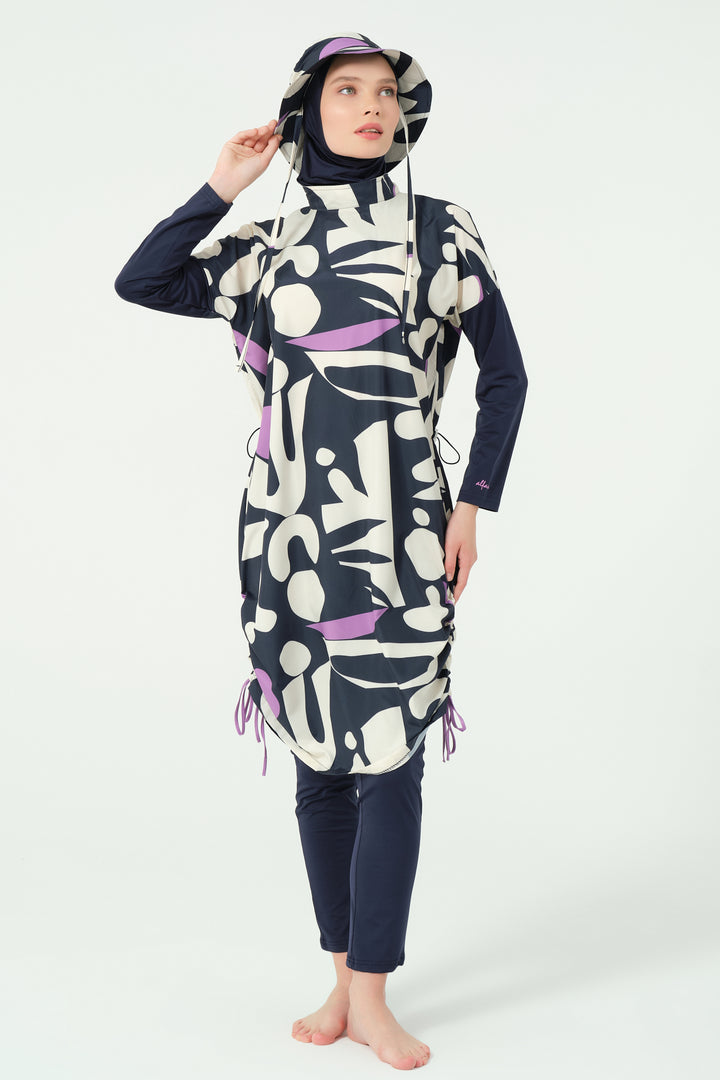 The set includes five pieces: Top, Leggings, Scarf, Hat, and One-Piece Bustier. Designed for quick drying and enhanced swimming comfort.
