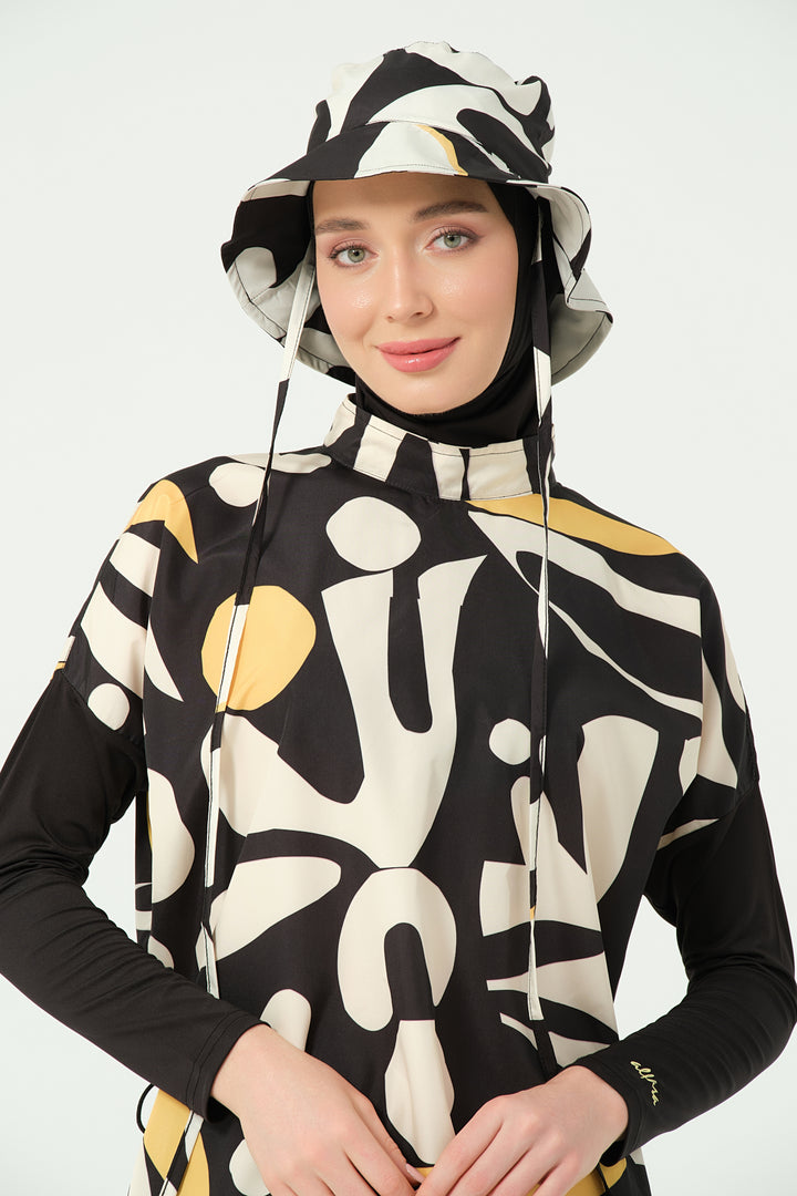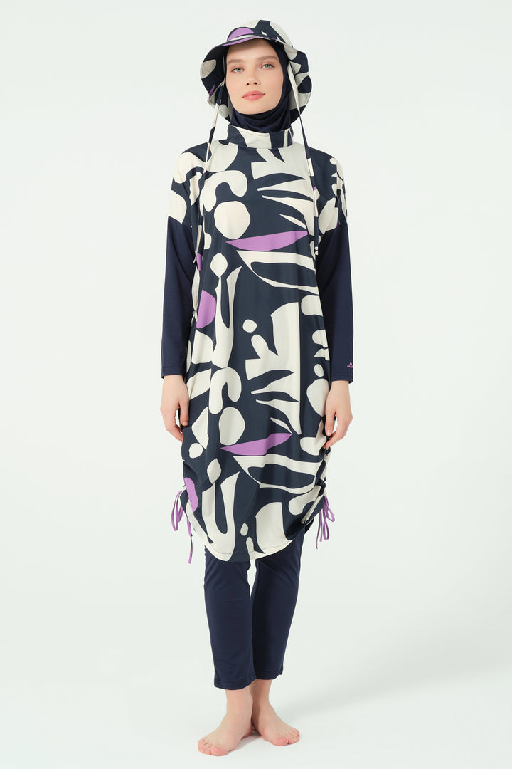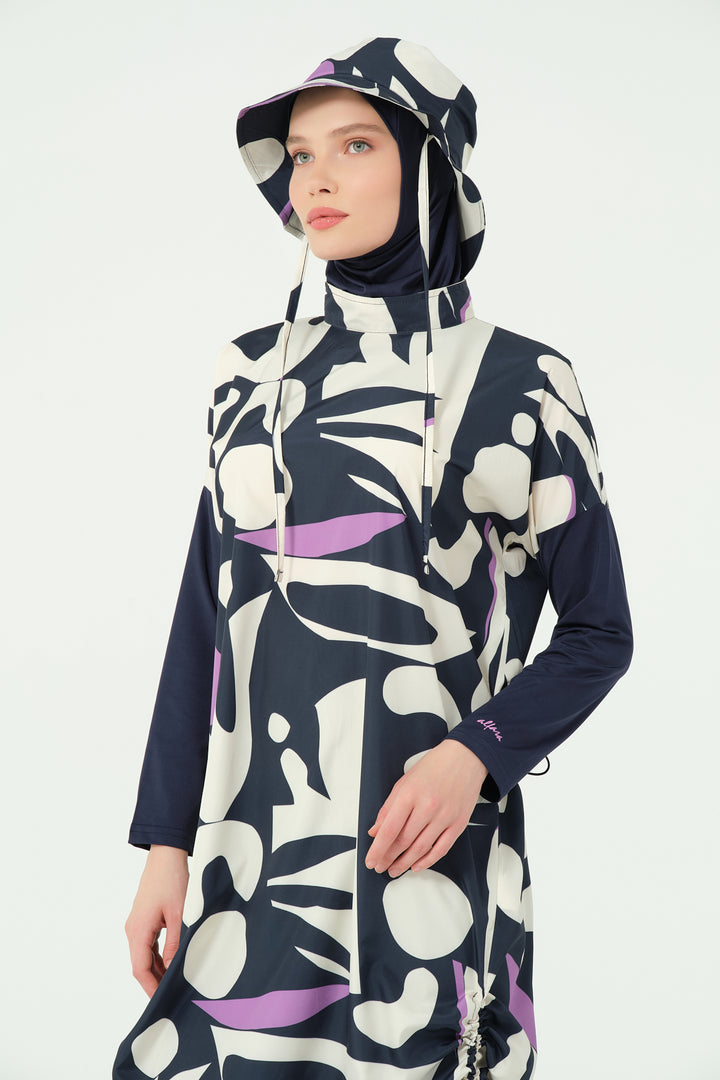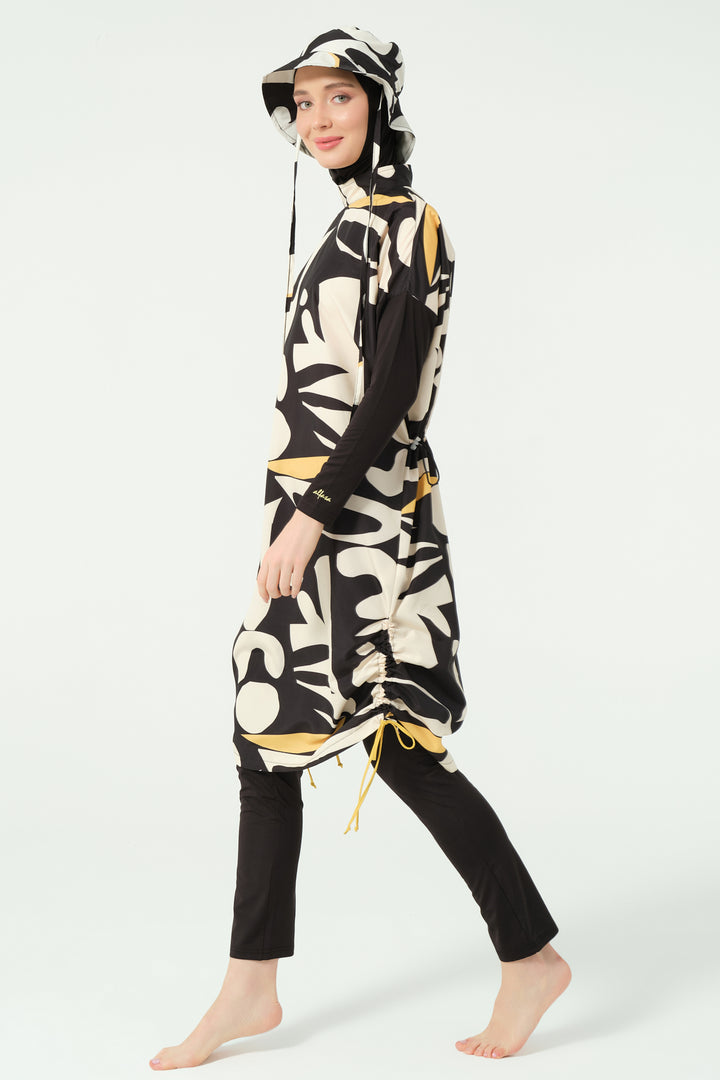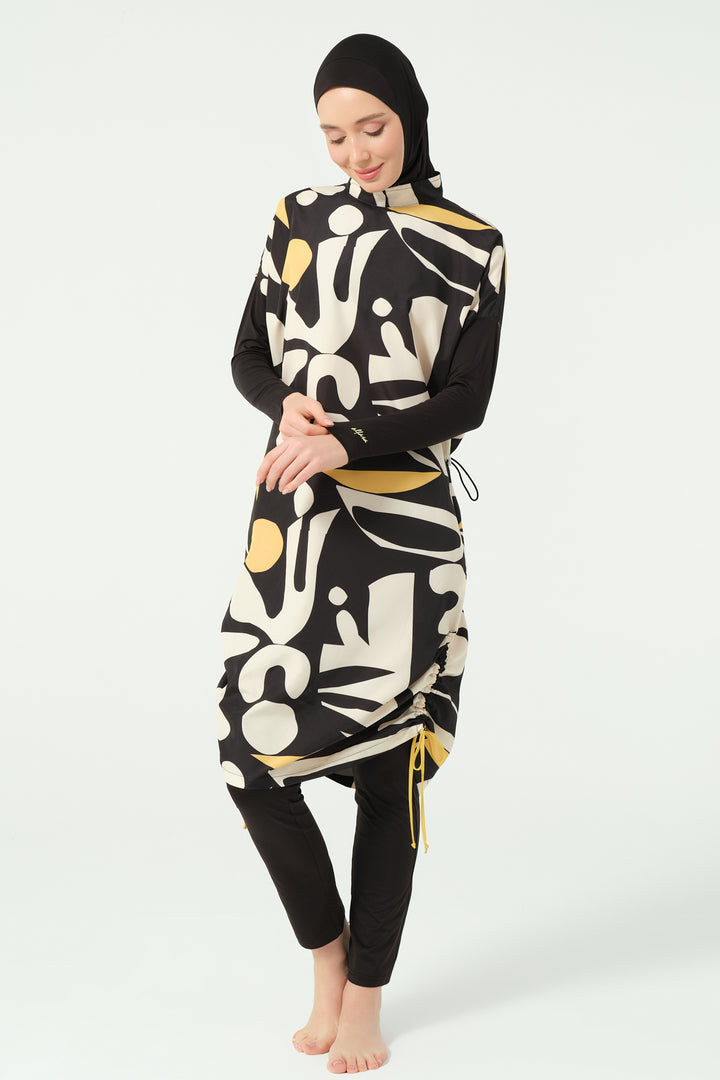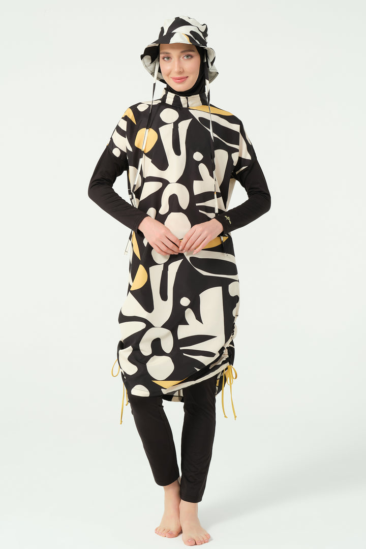 The set includes five pieces: Top, Leggings, Scarf, Hat, and One-Piece Bustier. Designed for quick drying and enhanced swimming comfort.