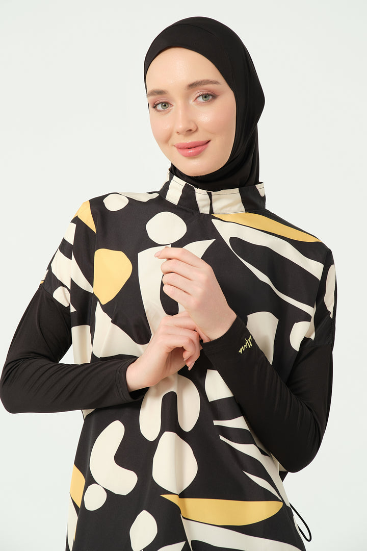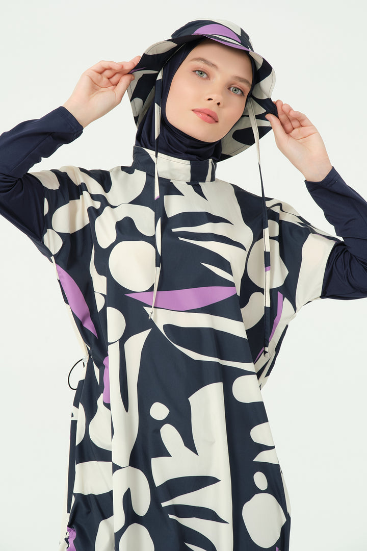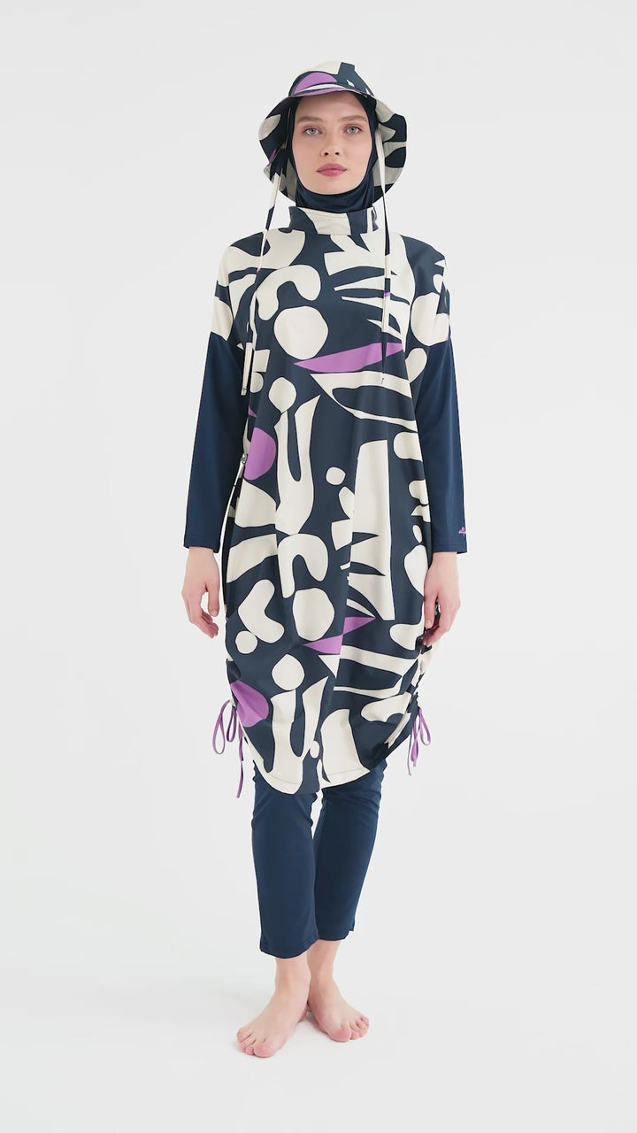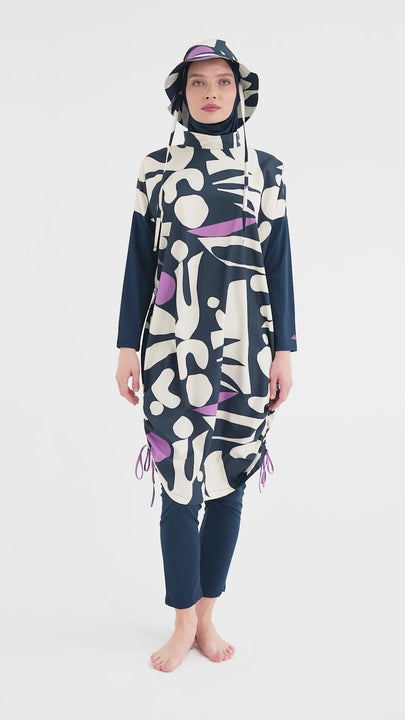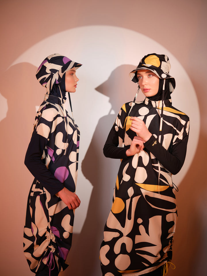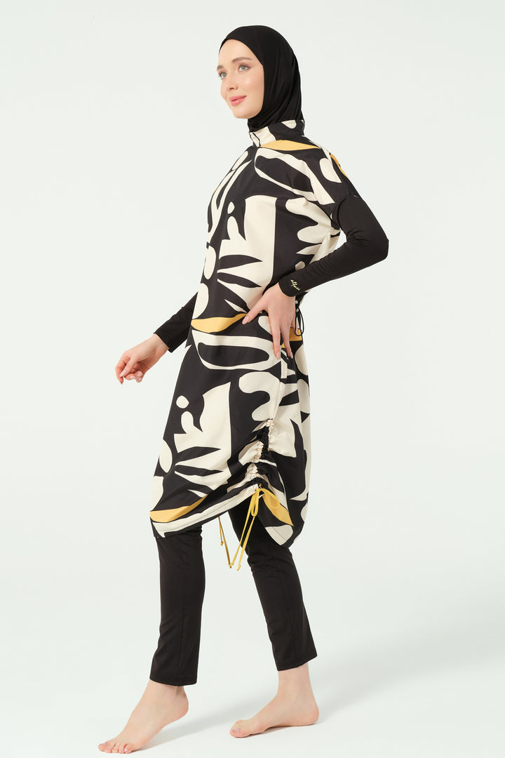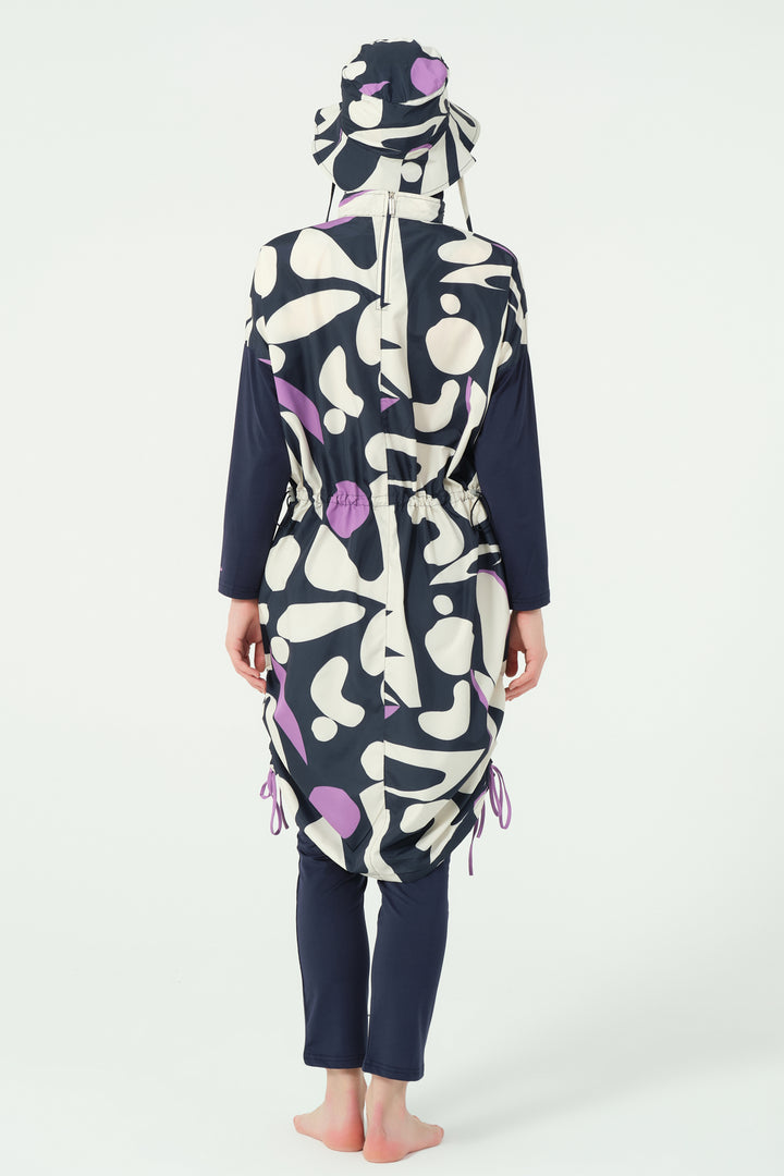 The set includes five pieces: Top, Leggings, Scarf, Hat, and One-Piece Bustier. Designed for quick drying and enhanced swimming comfort.