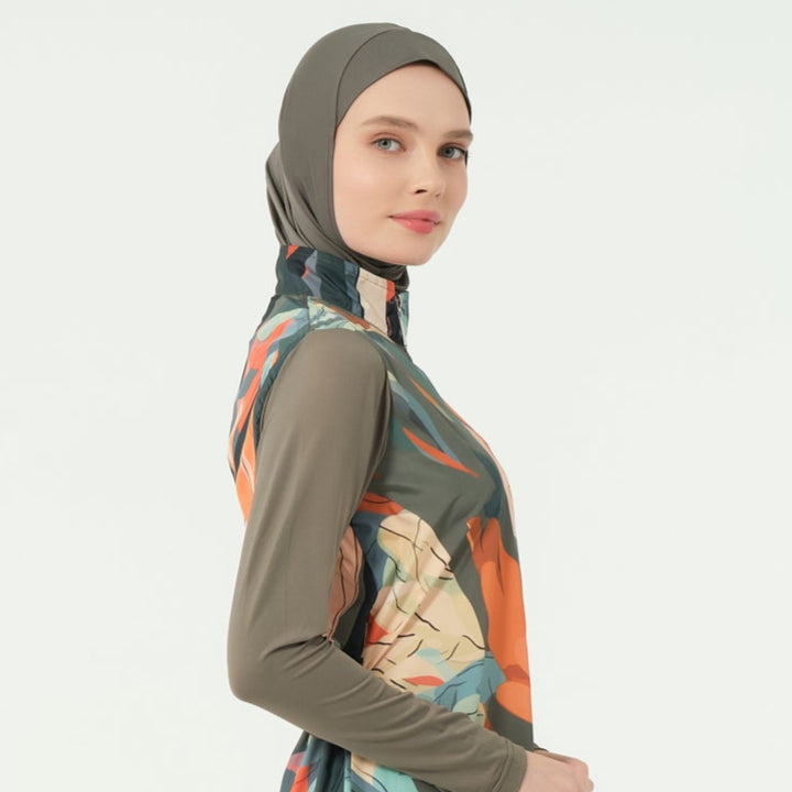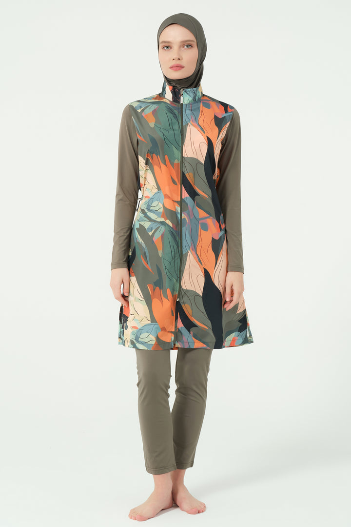 Crafted from water-repellent parachute fabric, this modest swimsuit features a nature-inspired patterned top with a front zipper closure and high collar. Lycra long sleeves and leggings provide flexibility and comfort. Comes complete with a lycra scarf, bonnet, and a one-piece inner bustier for secure and full coverage.