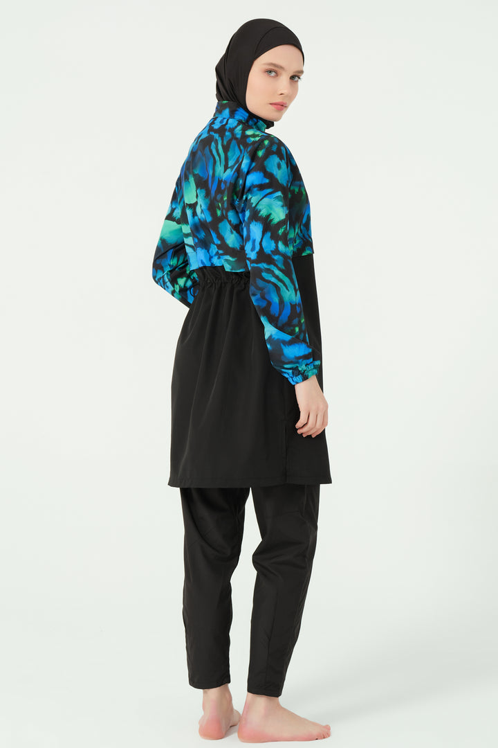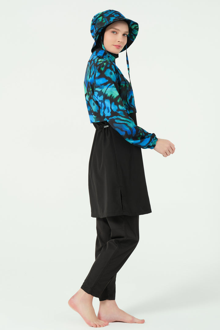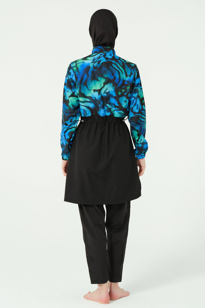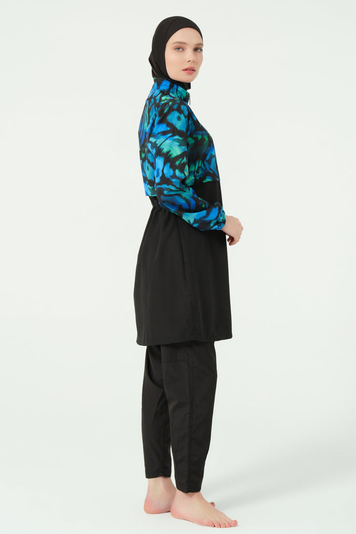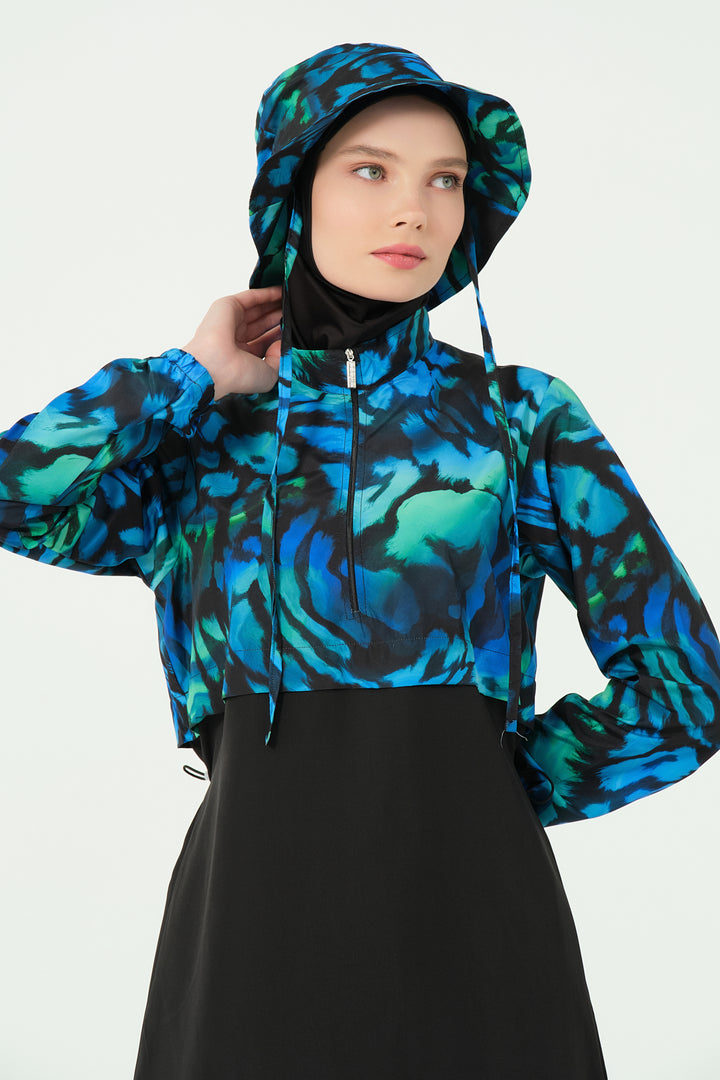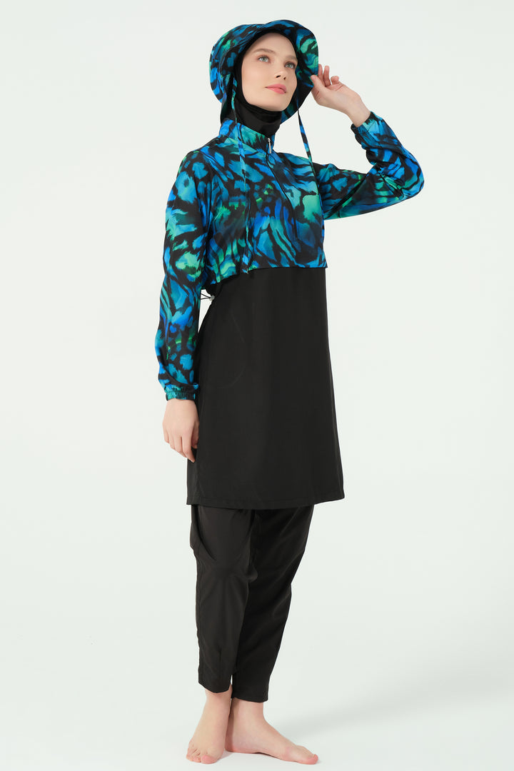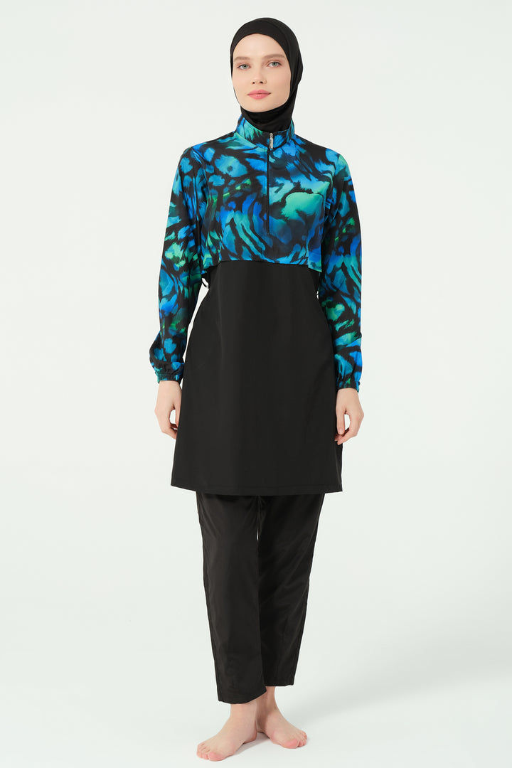 Combining style with functionality, this modest swimsuit set features a water-repellent parachute fabric. The patterned top offers a modern crop-style look with a half-zippered high collar and long sleeves for full coverage. The tailored swim pants include pleated cuffs and practical zippered pockets. A matching parachute-fabric hat and soft Lycra scarf add versatility and sun protection, while the integrated one-piece bustier ensures comfort and modesty.