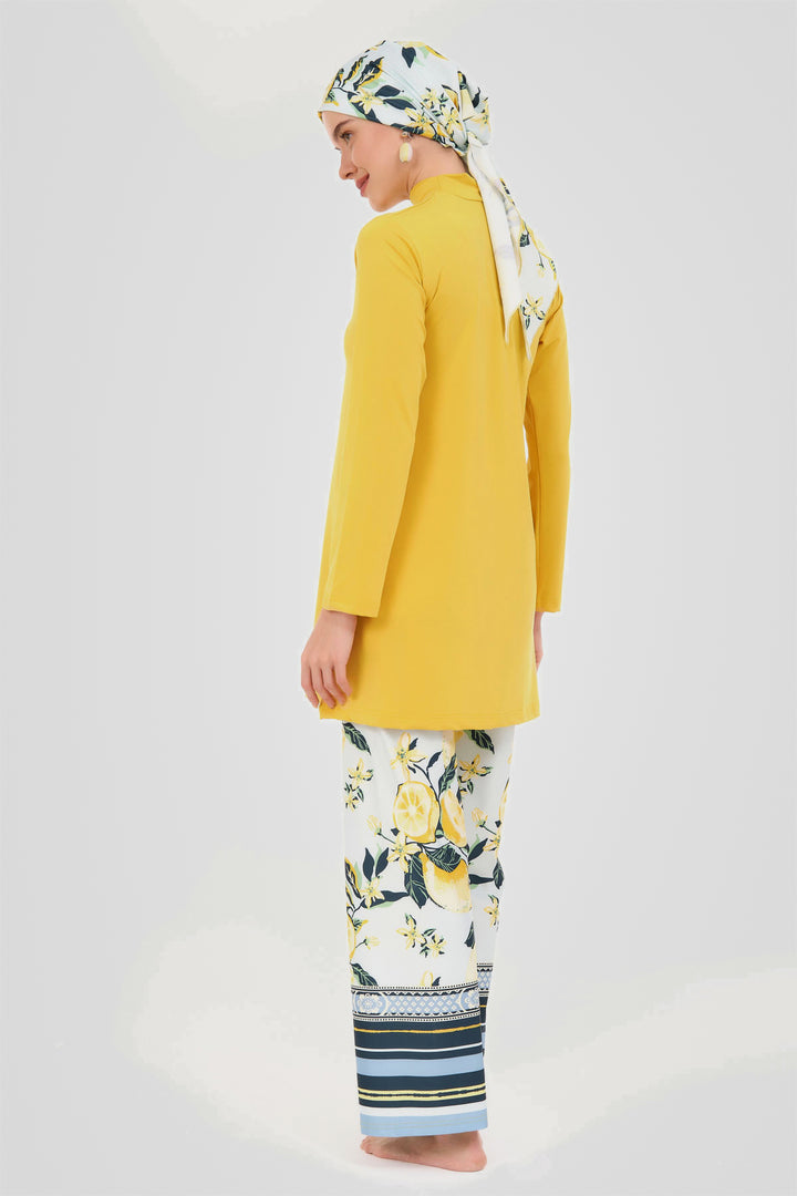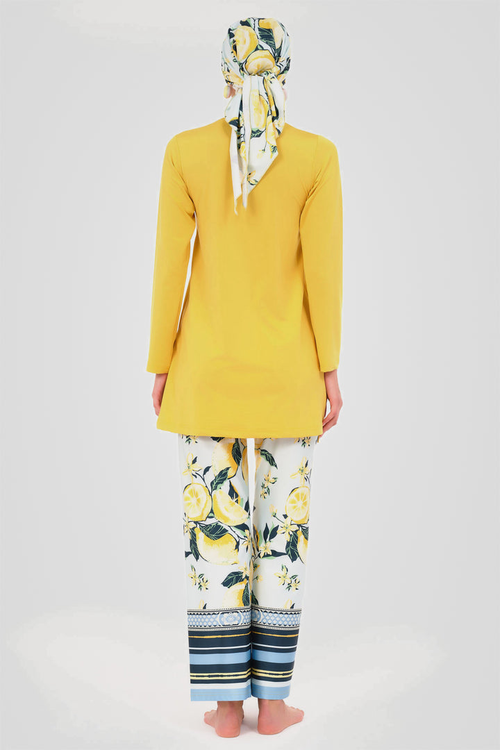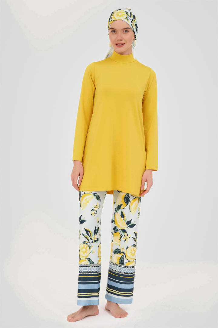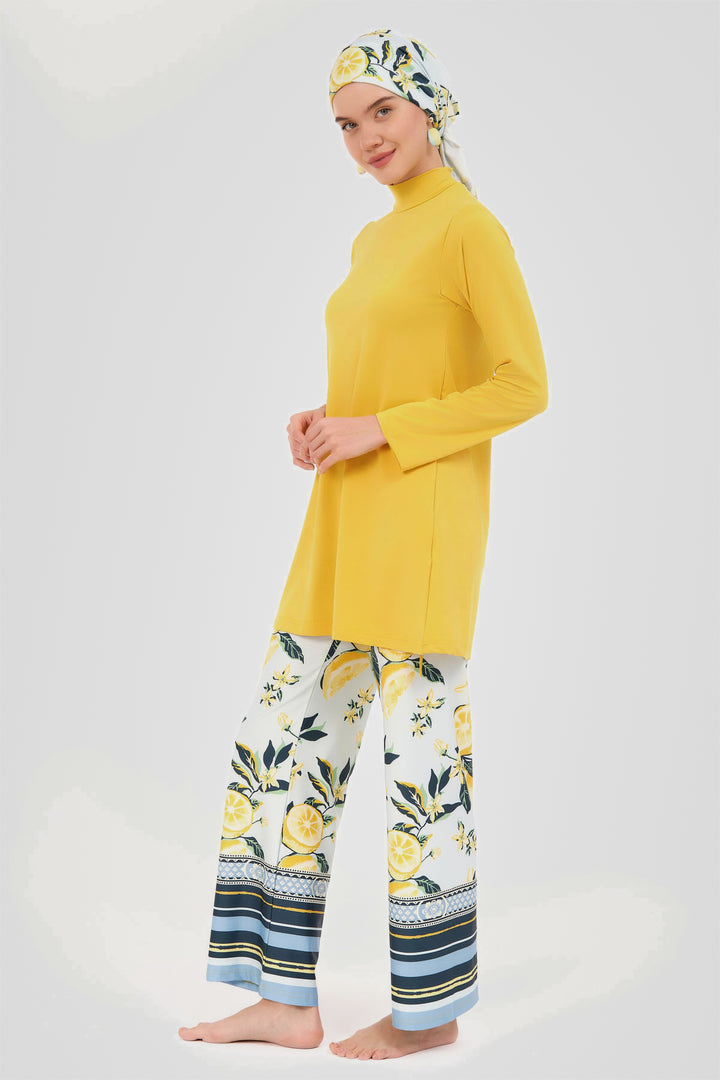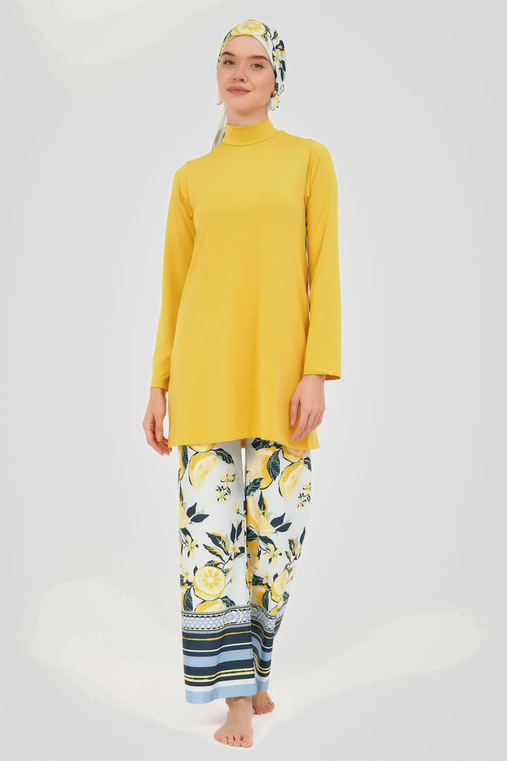 Introducing the Lemon Patterned Modest Swimsuit, a refreshing and stylish swimwear option designed with vibrant yellow hues and playful lemon patterns. Perfect for women seeking modesty without compromising on style, this swimsuit offers a comfortable and elegant fit with loose trousers and a relaxed silhouette. Ideal for both the sea and pool, its eye-catching design ensures you'll stand out while enjoying your time in the water.