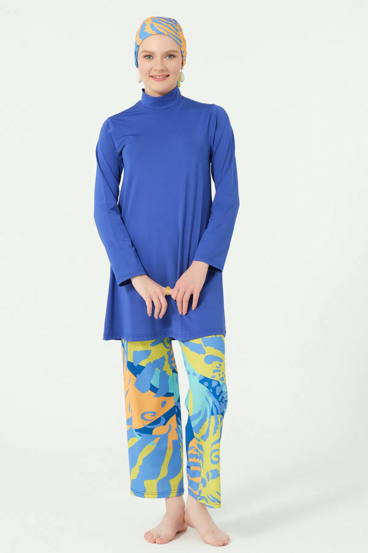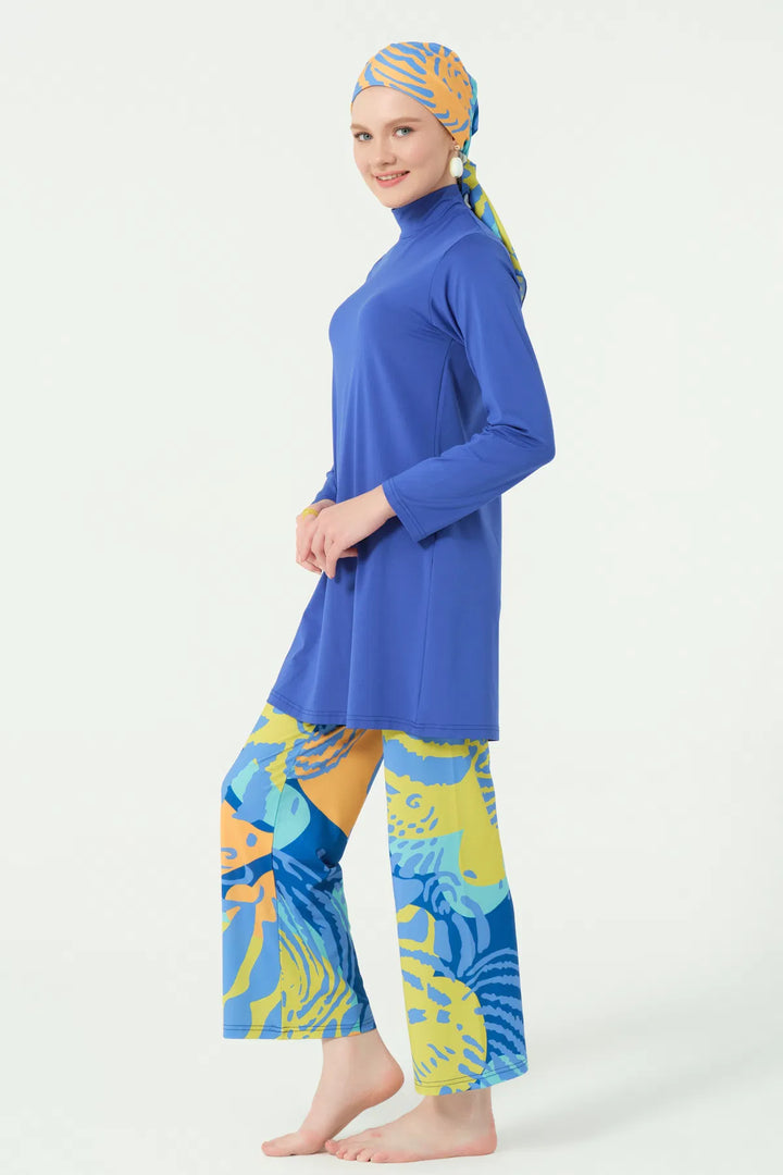 Crafted from premium water-repellent Lycra fabric, the Meriva features a classic, loose-fit top with long sleeves and a high collar for full coverage and comfort. The standout wide-leg pants are adorned with an all-over print and adjustable drawstrings at the hems for a customized fit. Completing the look is a coordinating patterned triangular scarf, a plain bonnet, and a supportive one-piece bustier—making this set an ideal choice for modern modest swimwear.