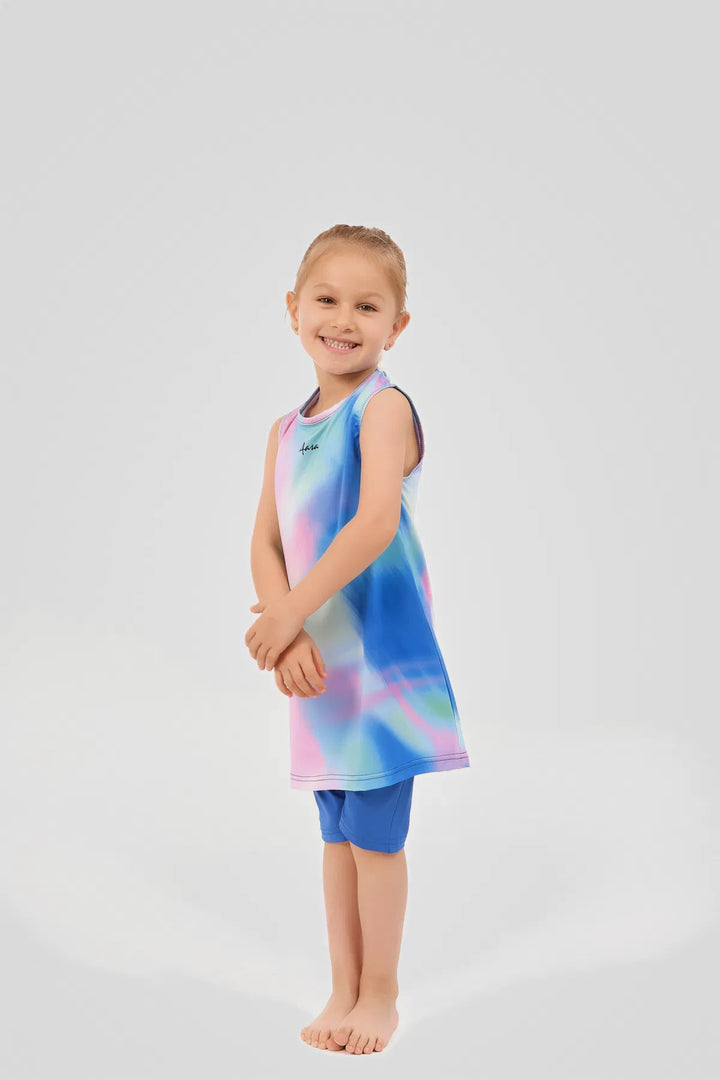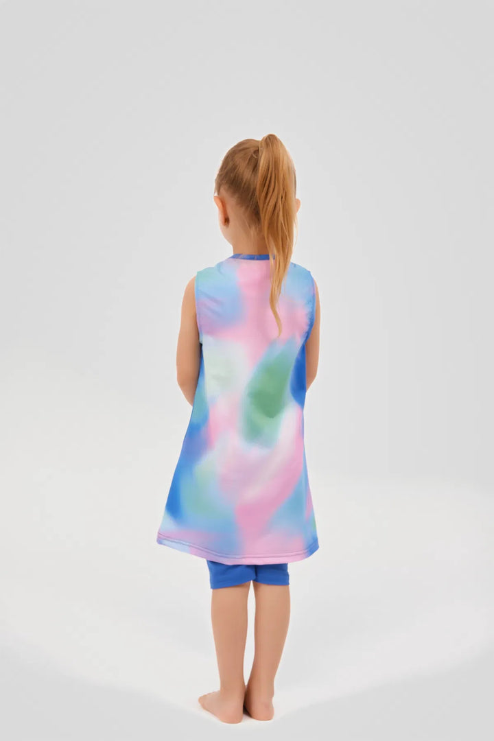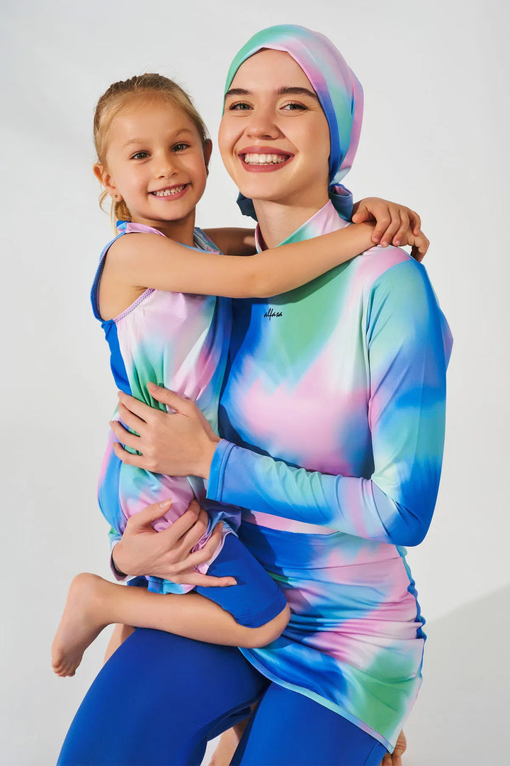 This 3-piece set includes a top, leggings, and a bonnet. Designed for quick drying and effortless swimming.
