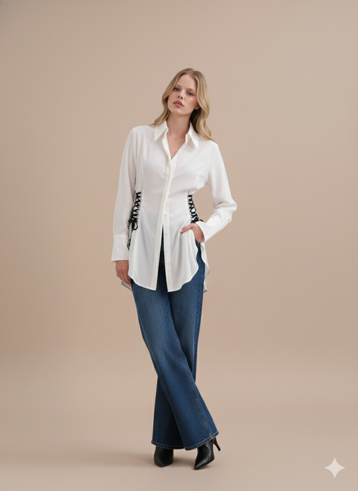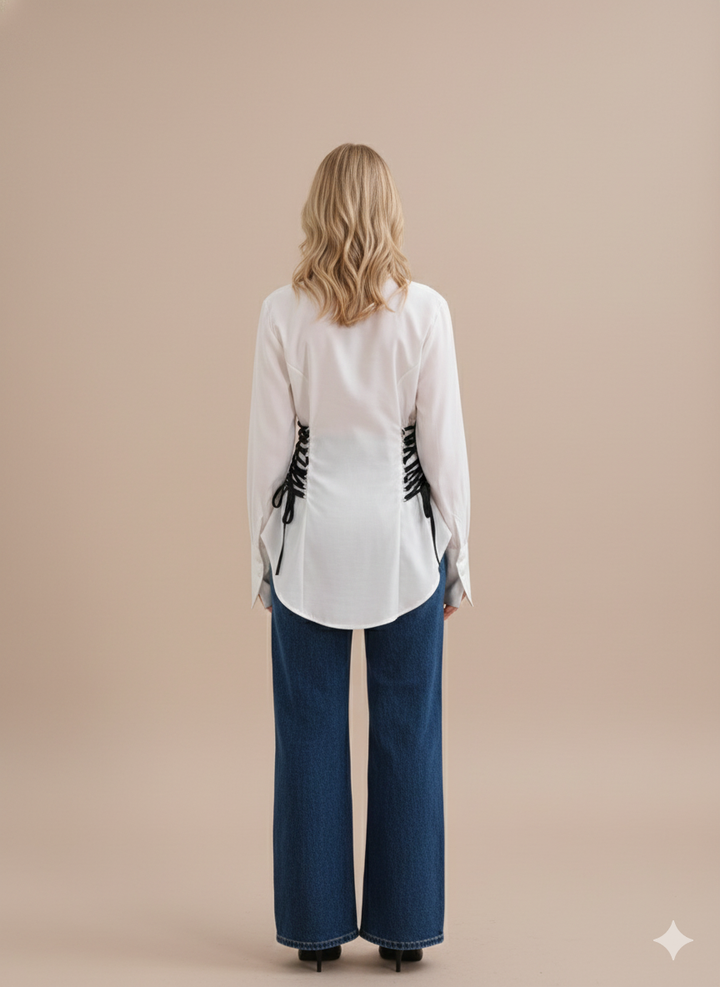 The Parisian Corset-Detail Shirt redefines classic shirting with a sophisticated edge, offering a piece that is both timeless and strikingly modern, perfect for elevating any curated wardrobe.