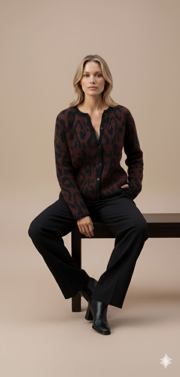 The Parisian Leo Cardigan reinterprets the classic animal motif with a sophisticated, luxurious touch, positioning it as a standout piece for the transitional and winter seasons.
