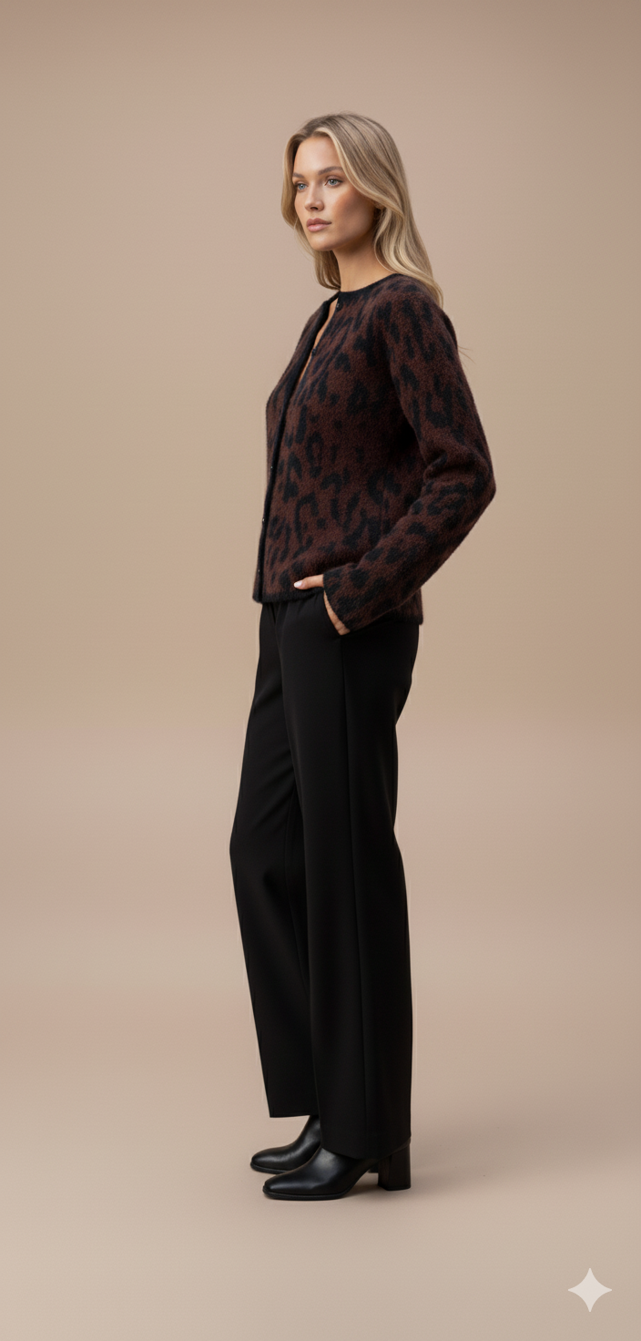 Meticulously crafted from a plush, mid-weight Wool-Blend Knit, the fabric offers exceptional warmth and a decadent, soft hand-feel that rivals pure cashmere. The distinctive leopard print uses rich, multi-tonal hues of chestnut brown and deep black, ensuring timeless elegance. The silhouette features a relaxed, straight cut with a subtly cropped length, designed for effortless layering without bulk.